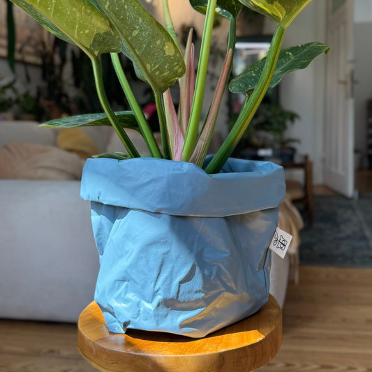 Das große Pottcover hat einen Durchmesser von 29 cm und eine von Höhe 26-32 cm. Je nachdem, ob du den Rand umkrempeln magst oder nicht. Durch den recht flexiblen Stoff kannst du dieses Pottcover als Übertopf für verschieden Topfgrößen nutzen. Wir empfehlen 22-29 cm. Das Material ist wasserabweisend. Das Pottcover ist faltbar und somit leicht zu verstauen. Bitte NICHT die Pflanze direkt in das Pottcover pflanzen.